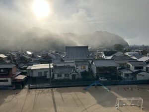 しかし現地の上郡小学校に着くとそのような風が無く、盆地の街では逆に山から谷を降りて来る東風が吹いていました。