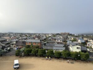 しかし現地の上郡小学校に着くとそのような風が無く、盆地の街では逆に山から谷を降りて来る東風が吹いていました。
